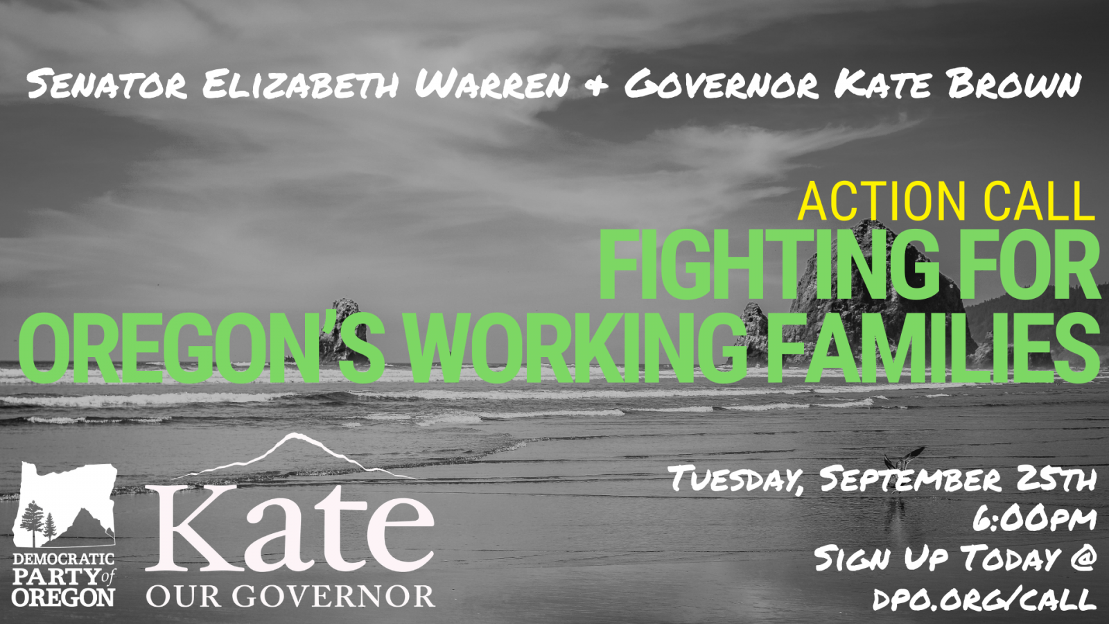 This Tuesday, September 25th at 6pm PST, join this Action Call to hear U.S. Senator Elizabeth Warren speak live about why she is endorsing Governor Kate Brown and ways progressives in Oregon can come together to fight back on extreme, right wing interest groups to re-elect a progressive leader who has fought tirelessly for working Oregonians and stood up for our values.