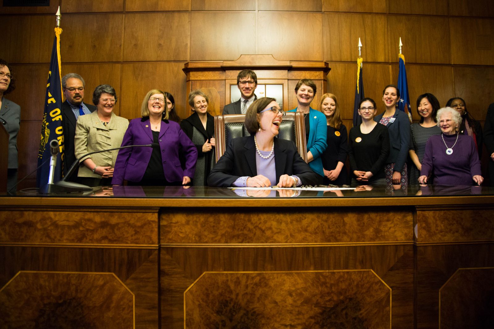 Among those she thanked were: Senate Majority Leader Diane Rosenbaum; House Majority Leader Val Hoyle; Sens. Elizabeth Steiner Hayward, Chip Shields, and Sara Gelser; Reps. Lew Frederick, Brent Barton, and Shemia Fagan; and the Oregon Association of County Clerks. The Governor also recognized the League of Women Voters of Oregon, Oregon Student Association, CAUSA, The Bus Project, Urban League of Portland, Asian Pacific American Network of Oregon, Oregon Voice, and her former staff in the Secretary of State's Office.